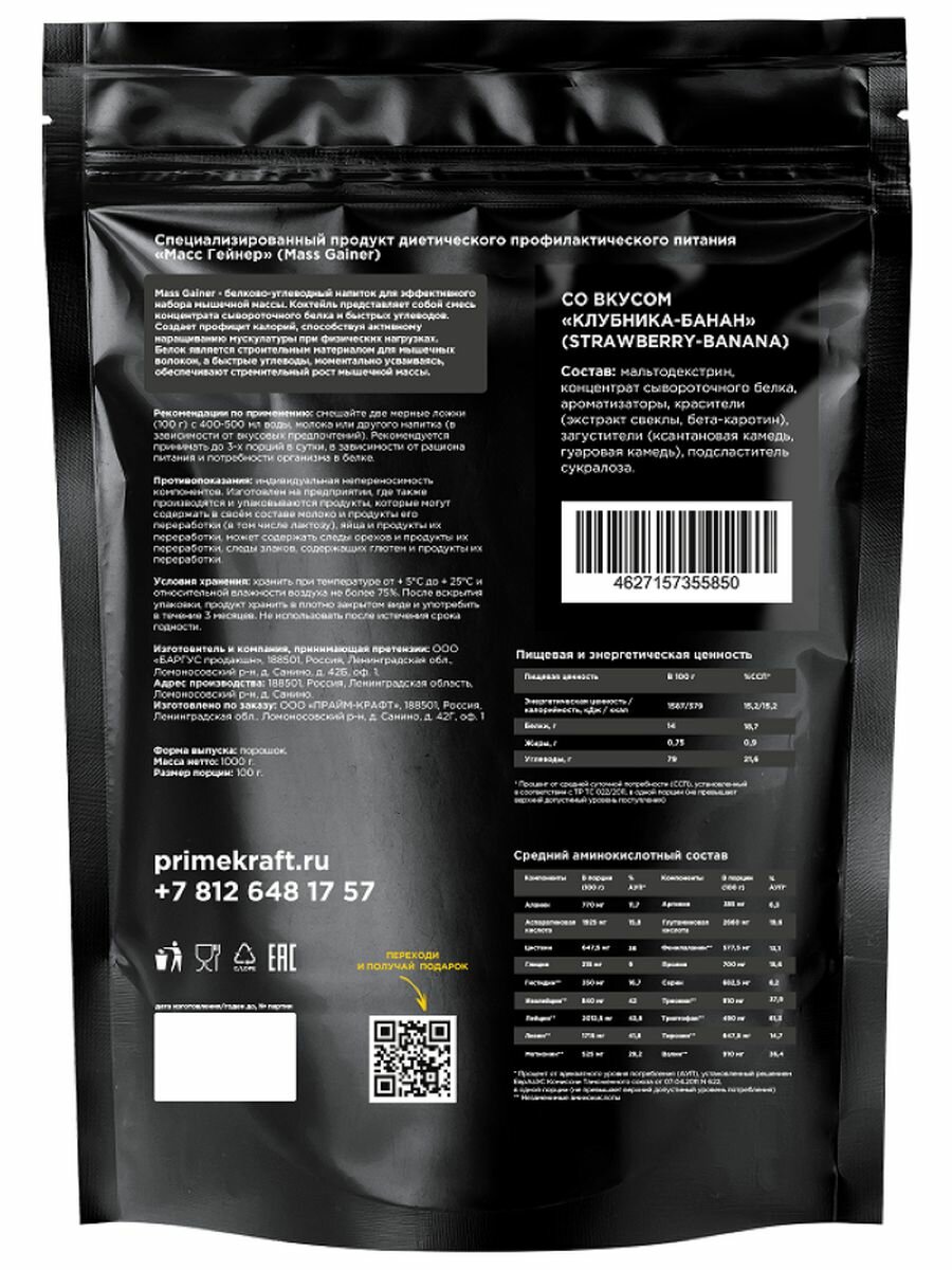 Прайм кр, Гейнер белково-углеводный Клубника банан 1000 гр интересное: