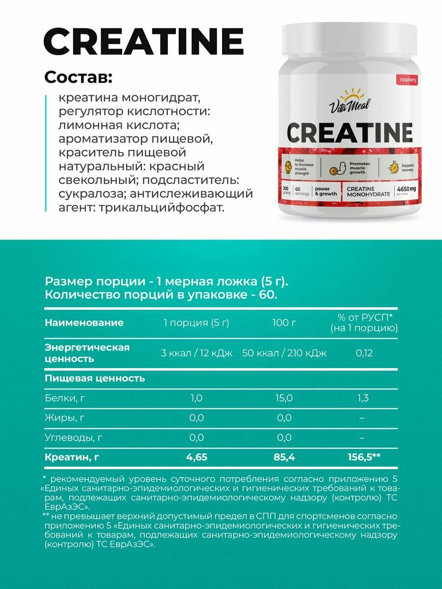 Купить Креатин моногидрат порошок Creatine Monohydrate VitaMeal 300 г, Малина
