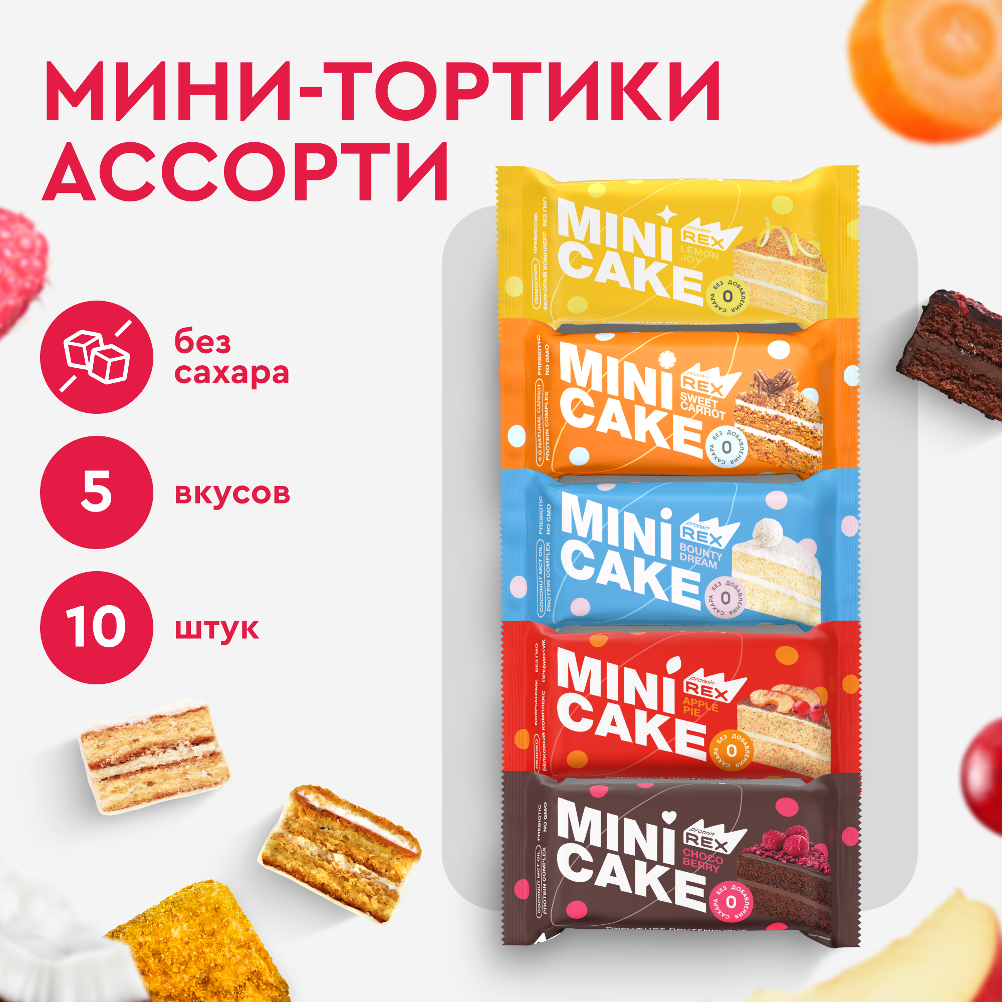 Купить Протеиновое пирожное ProteinRex Тортик мини Ассорти 10 шт десерт без сахара, низкокалорийное печенье, батончики, ПП сладости 167 ккал