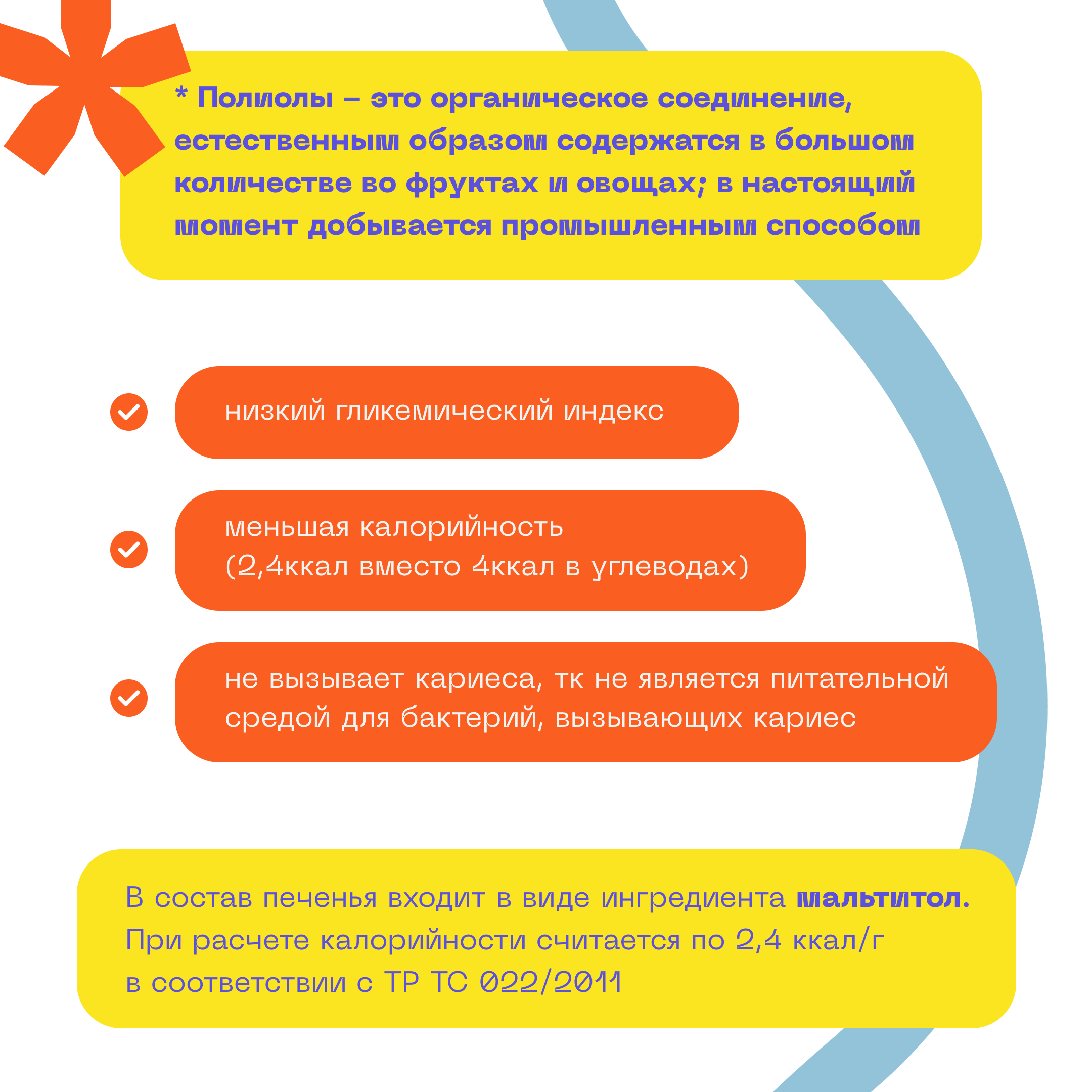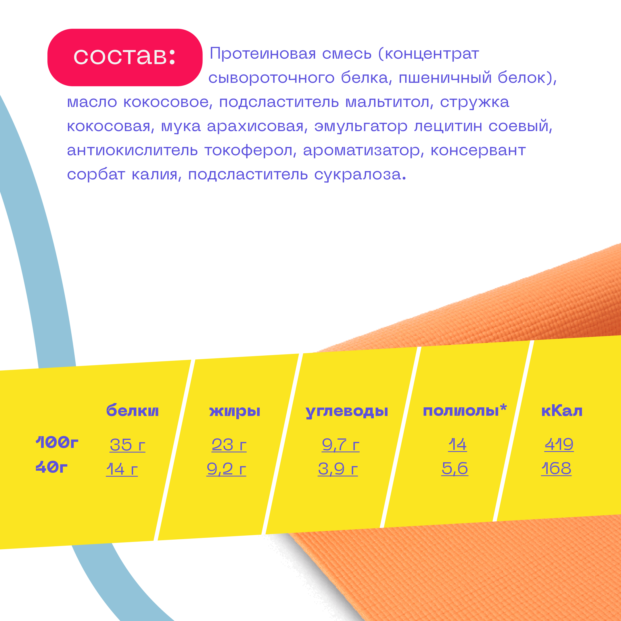 | Дополнительная информация | "Состав: Протеиновая смесь (концентрат сывороточного белка, пшеничный белок), масло кокосовое, подсластитель мальтитол, мука арахисовая, эмульгатор лецитин соевый, антиокислитель токоферол, ароматизатор, консервант сорбат калия, подсластитель сукралоза.Пищевая и энергетическая ценность на 100г: Белки 35г, жиры 23г, углеводы 9,7г, полиолы 14г, 419 ккал/1754 кДж/ на порцию: Белки 14г, жиры 9,2г, углеводы 3,9г, полиолы 5,6г, 168 ккал/703 кДж. Способ применения: Это печенье отлично разнообразит ваш рацион. 2 штуки в день заменят один прием пищи и обеспечат до 30% дневной потребности в белке* (*в зависимости от индивидуальных параметров)" |