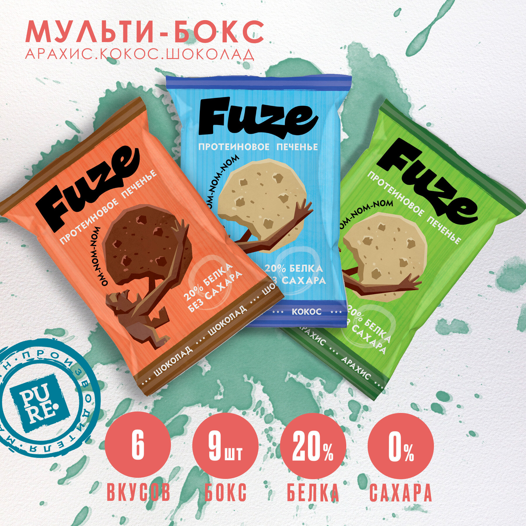Печенье протеиновое без сахара Fuze. Мультибокс: Миндаль, Арахис, Кокос (бокс = 9 уп.)