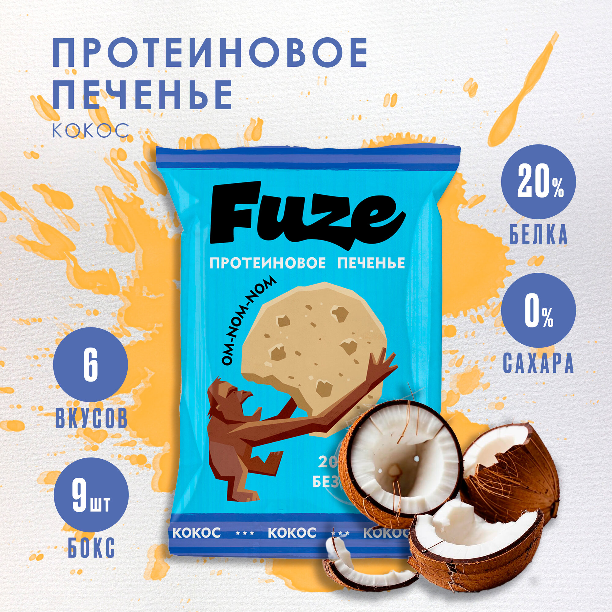 Печенье Fuze с высоким содержанием белка . Вкус Кокос (бокс = 9 уп.)