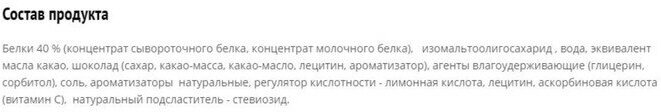 | Дополнительная информация | форма выпуска: батончик; состав: белки 40 % (концентрат сывороточного белка, концентрат молочного белка), изомальтоолигосахарид , вода, эквивалент масла какао, малина, агенты влагоудерживающие (глицерин, сорбитол), соль, ароматизаторы натуральные, регулятор кислотности - лимонная кислота, аскорбиновая кислота(витамин С), подсластитель - стевиозид. |