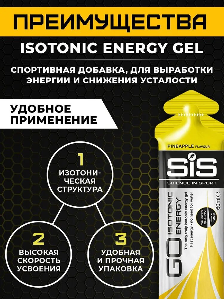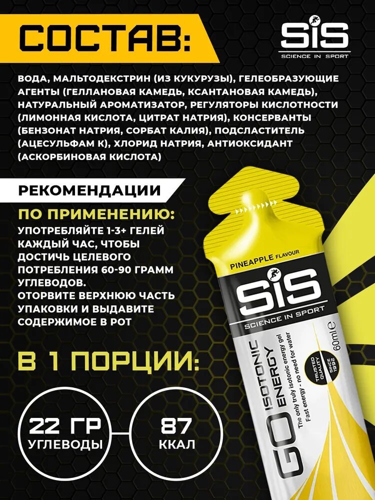 | Дополнительная информация | изотонический углеводный энергетический гель SiS GO Isotonic Energy обеспечивает легкое усваивание и быструю подачу углеводов для выработки энергии во время физических нагрузок; основной действующий компонент: мальтодекстрин; назначение: восстановление, повышение работоспособности; рекомендации по применению: 1 гель каждые 30-40 минут, максимум 3 геля в час |