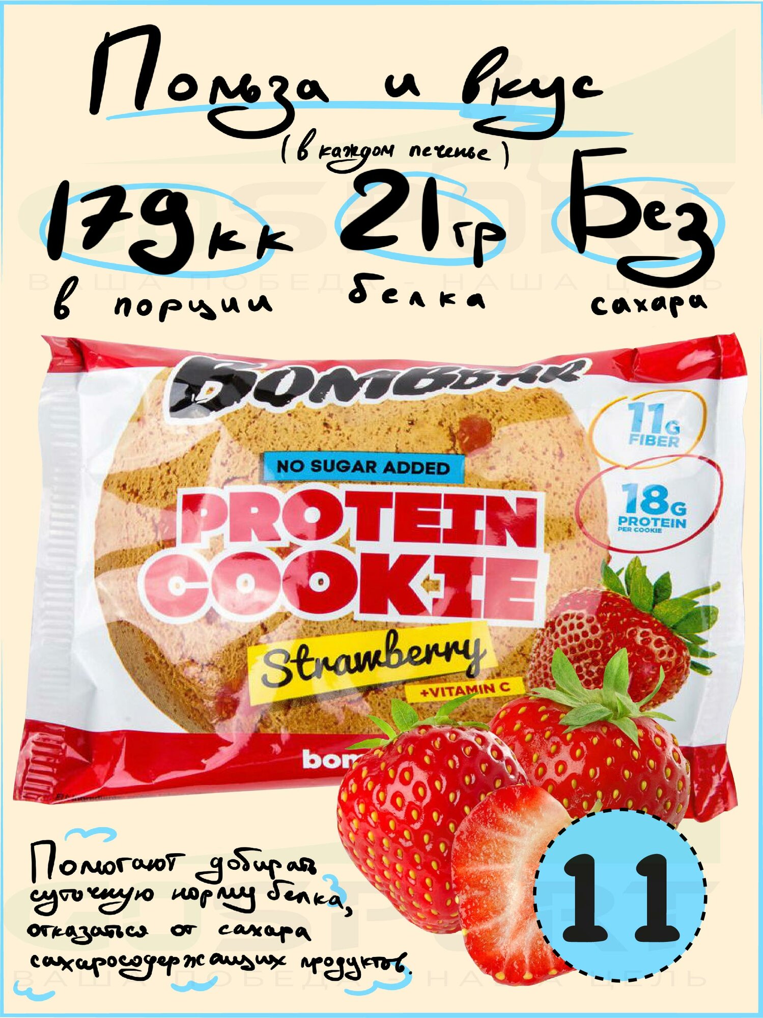 Протеиновый батончик Bombbar Protein cookie 11 протеин печенье x 60 г, Клубника интересное: