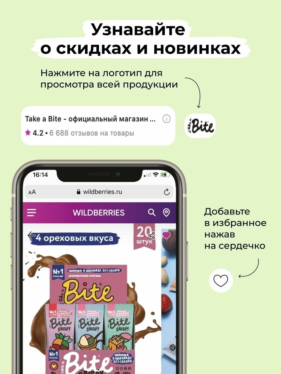 СохранитьПротеиновые батончики без сахара Take a Bite, ассорти из 6 вкусов, 6 шт по 50 гр интересное: