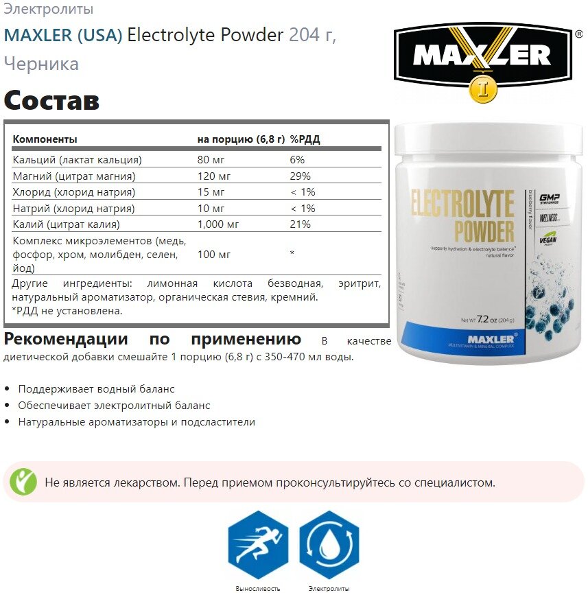 Электролиты в шипучках MAXLER (USA) Electrolyte Powder 204 г, Черника интересное: