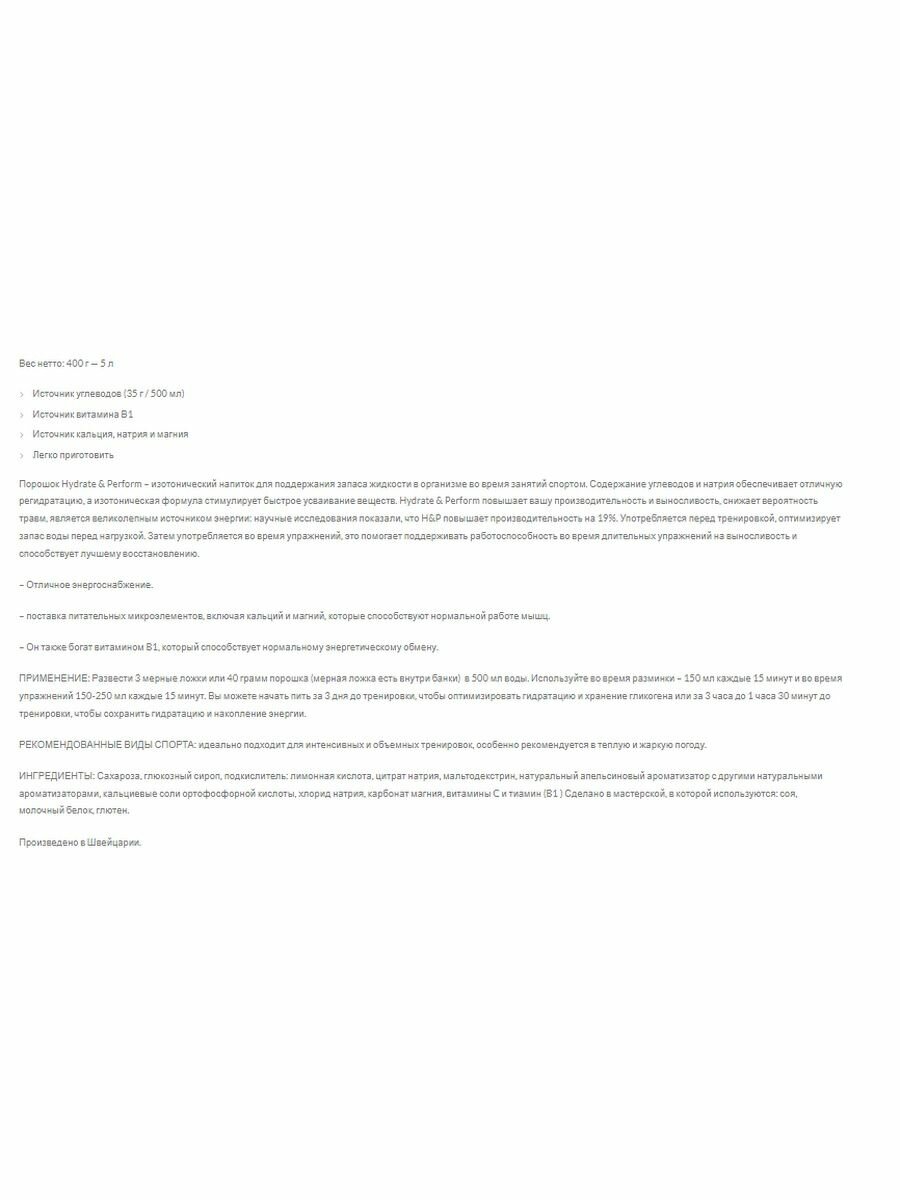 | Рекомендации по применению | используйте во время разминки – 150 мл каждые 15 минут и во время упражнений 150-250 мл каждые 15 минут; вы можете начать пить за 3 дня до тренировки, чтобы оптимизировать гидратацию и хранение гликогена или за 3 часа до 1 часа 30 минут до тренировки, чтобы сохранить гидратацию и накопление энергии |
