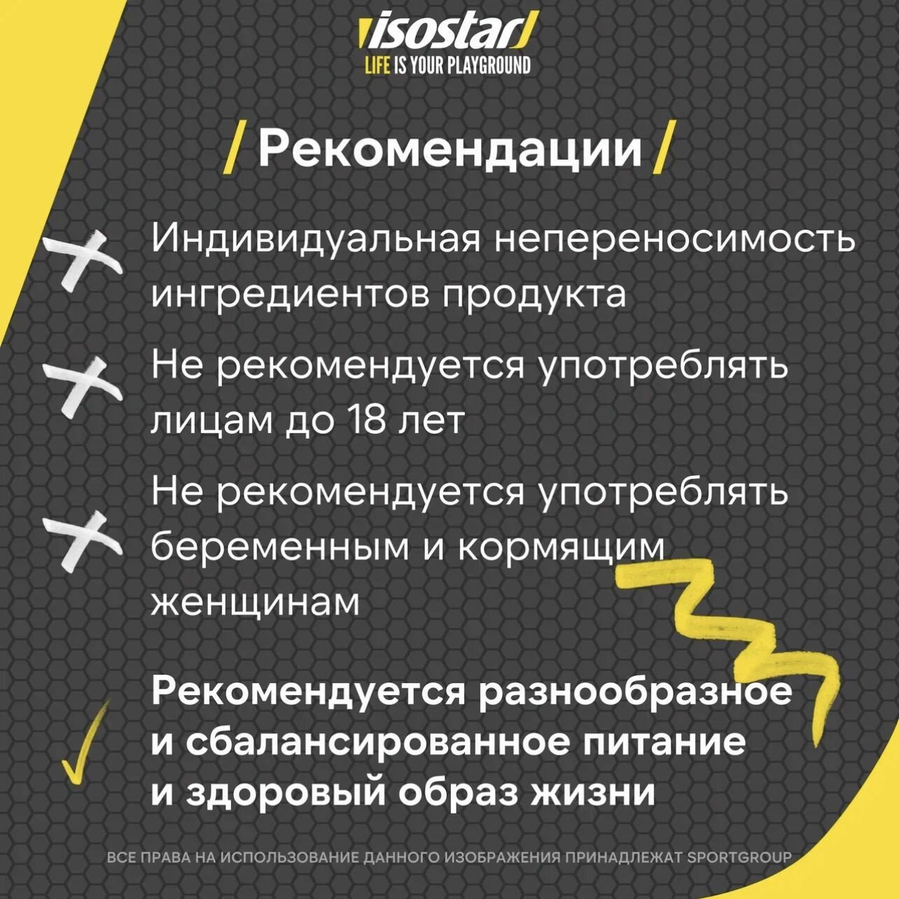 | Рекомендации по применению | Развести 3 ложки (в упаковке) порошка в 500 мл воды. Используйте во время разминки – 150 мл каждые 15 минут и во время упражнений 150-250 мл каждые 15 минут. Вы можете начать пить за 3 дня до тренировки, чтобы оптимизировать гидратацию и хранение гликогена или за 3 часа до 1 часа 30 минут до тренировки, чтобы сохранить гидратацию и накопление энергии. |