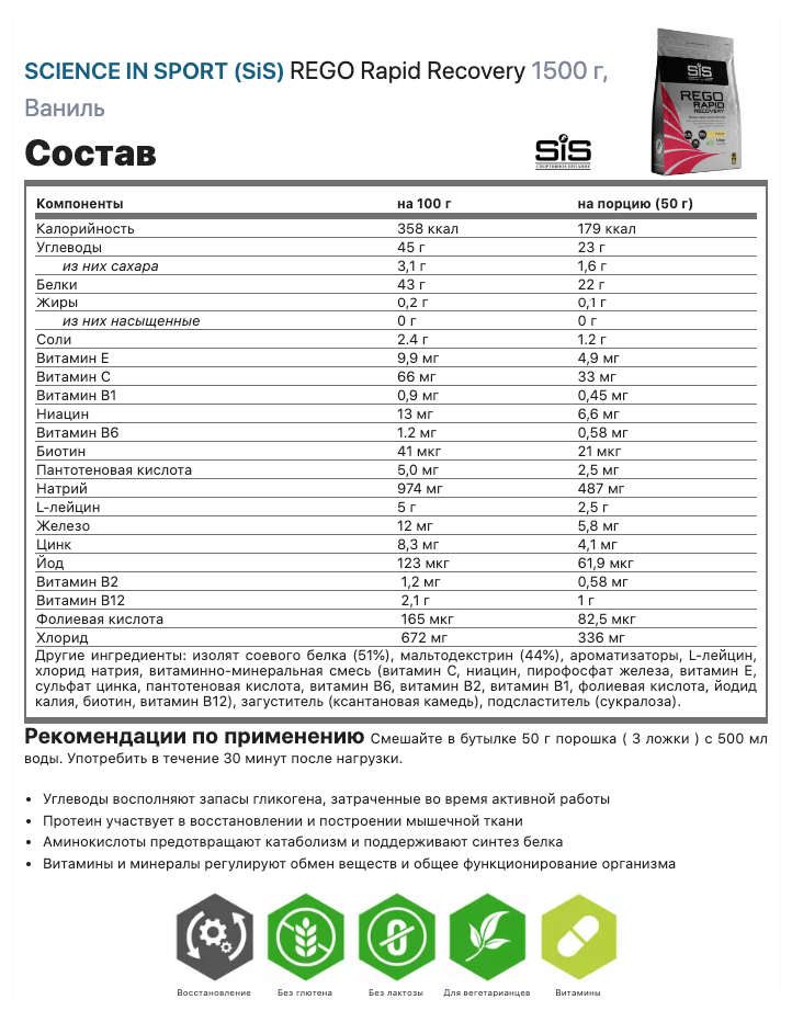 Восстановление SCIENCE IN SPORT (SiS) REGO Rapid Recovery 1500 г, Ваниль интересное: