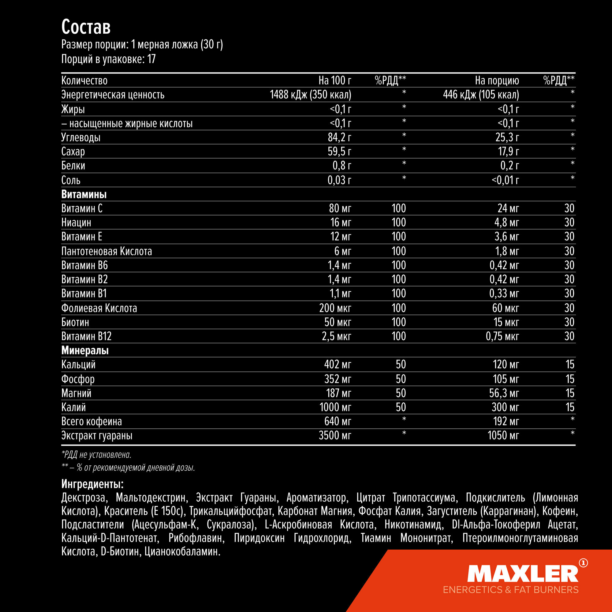 | Основные ингредиенты | витамины и минералы / кофеин / таурин / экстракт гуараны |