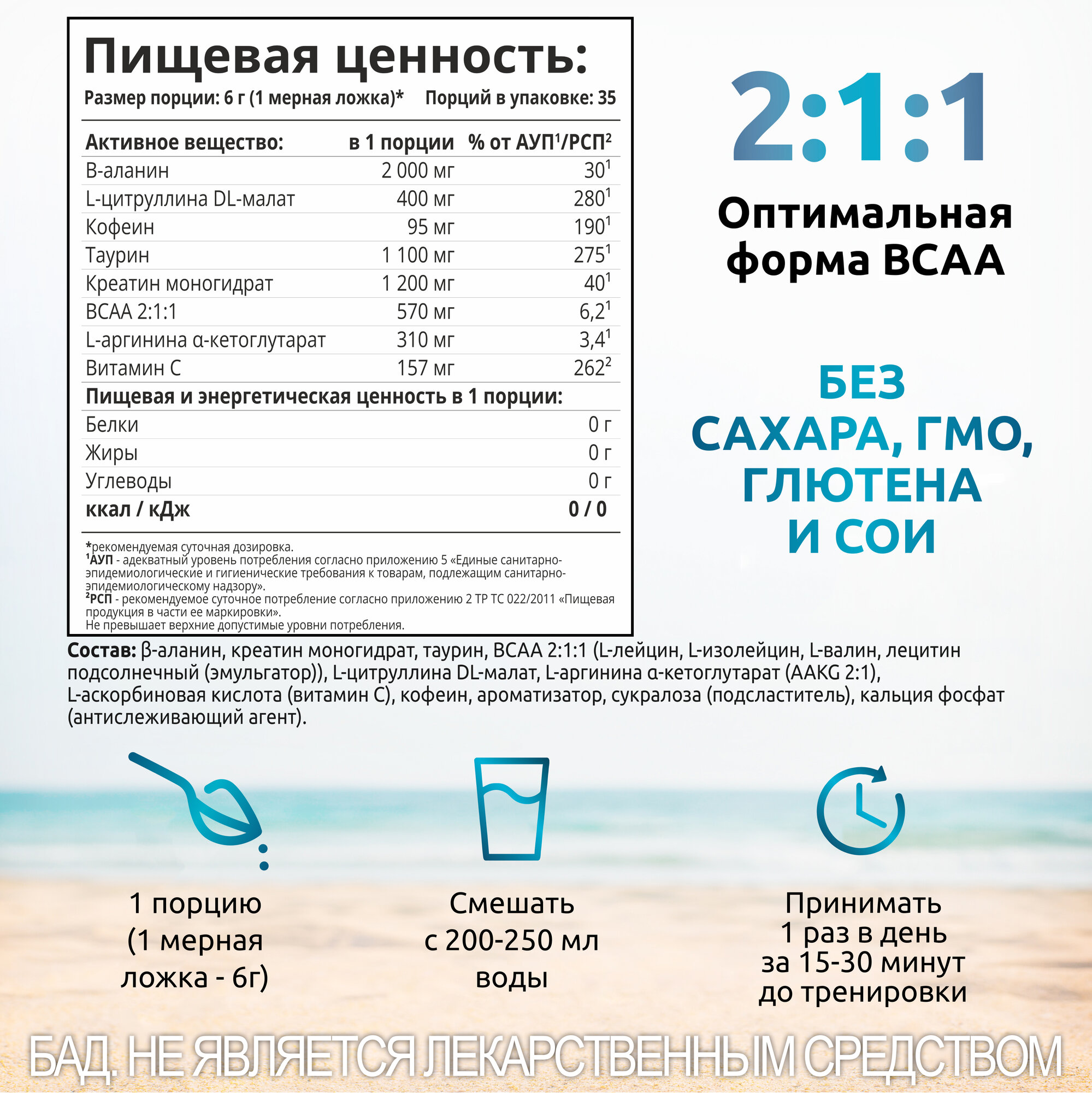 | Дополнительная информация | Состав: β-аланин, креатин моногидрат, таурин, BCAA 2:1:1 (L-лейцин, L-изолейцин, L-валин, лецитин подсолнечный (эмульгатор)), L-цитруллина DL-малат, L-аргинина α-кетоглутарат (AAKG 2:1), L-аскорбиновая кислота (витамин С), кофеин, ароматизатор, сукралоза (подсластитель), кальция фосфат (антислеживающий агент). |