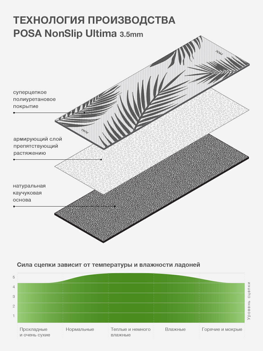 Профессиональный коврик для йоги каучук + полиуретан POSA NonSlip Ultima 3.5mm Green Leaves / Нескользящий йога мат POSA Yoga / Спортивный гимнастический коврик 3.5 мм для фитнеса, пилатеса, растяжки