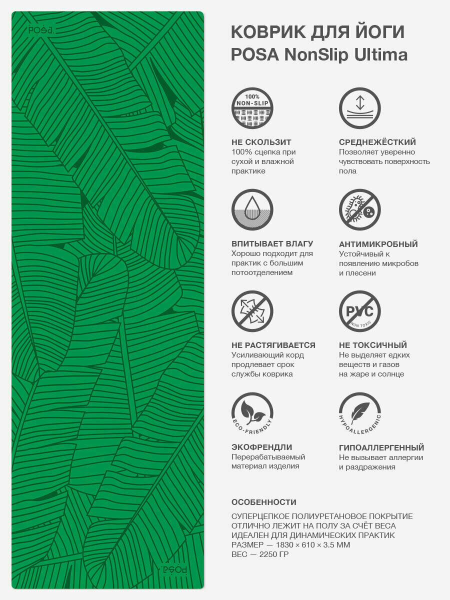 СохранитьПрофессиональный коврик для йоги каучук + полиуретан POSA NonSlip Ultima 3.5mm Green Leaves / Нескользящий йога мат POSA Yoga / Спортивный гимнастический коврик 3.5 мм для фитнеса, пилатеса, растяжки интересное: