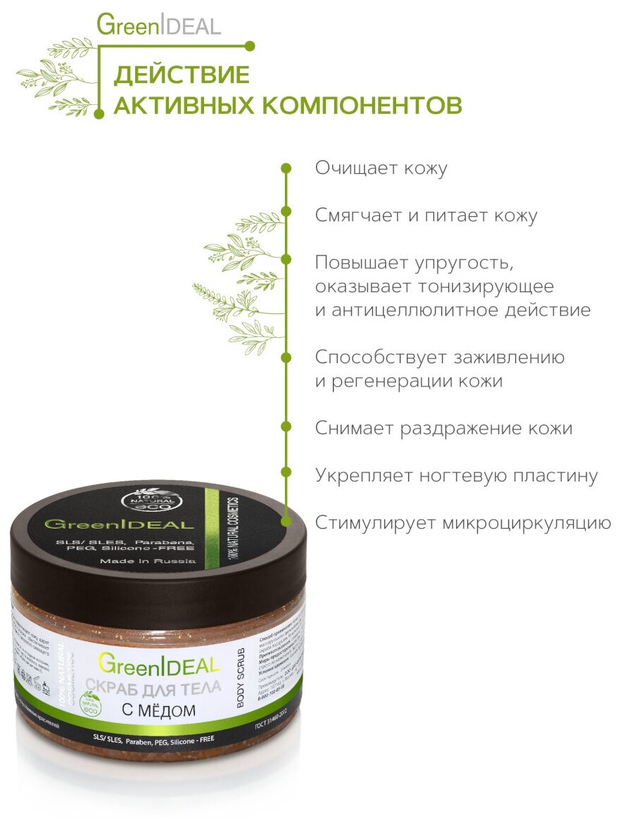 GreenIDEAL Антицеллюлитный сахарный солевой скраб для кожи тела рук и ног с Медом Натуральный пилинг интересное: