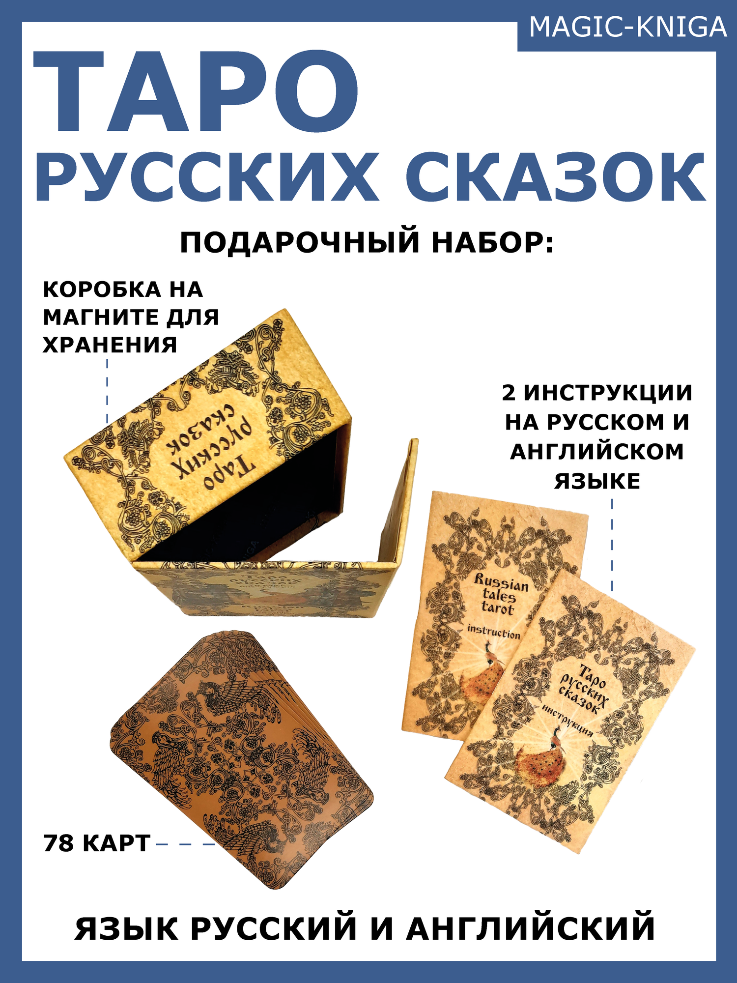 | Подробная комплектация | 78 карт, две инструкции (МБК) на русском и английском языке, коробка на магните |