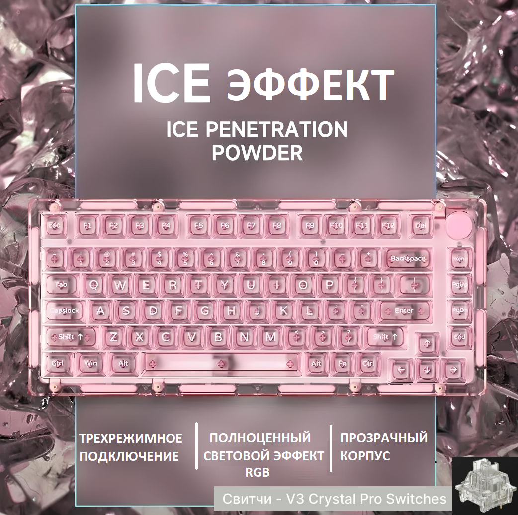 Механическая беспроводная прозрачная клавиатура Monsgeek ICE 75, 75%, Hotswap, RGB, Русская раскладка, розовый