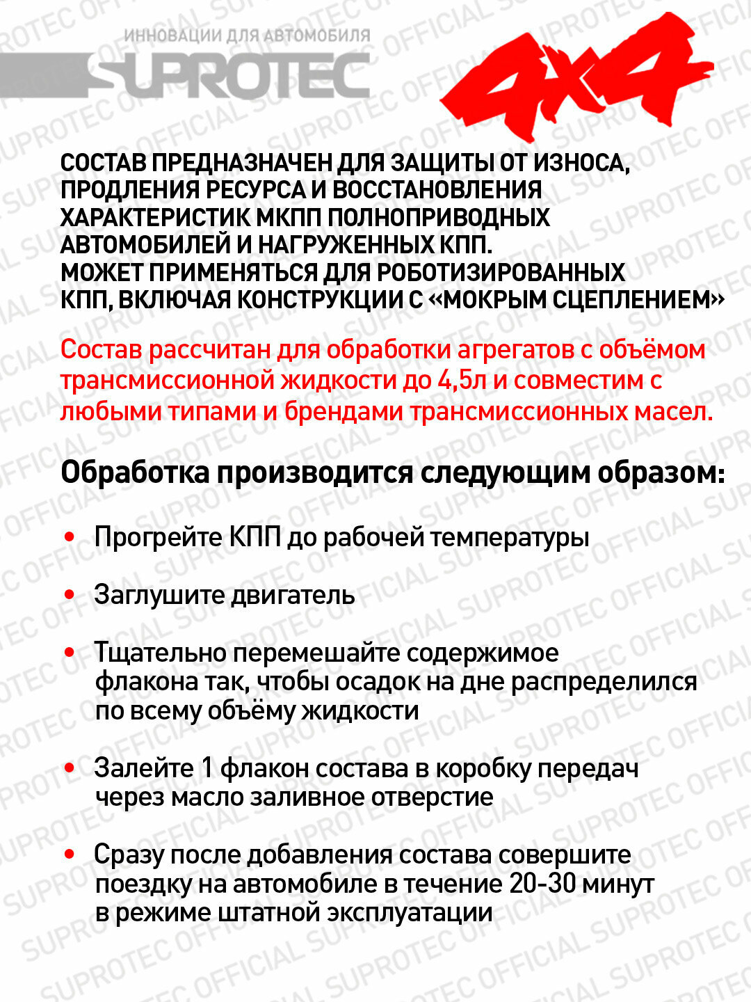 | Состав | базовое трансмиссионное масло и геомодификатор Супротек |