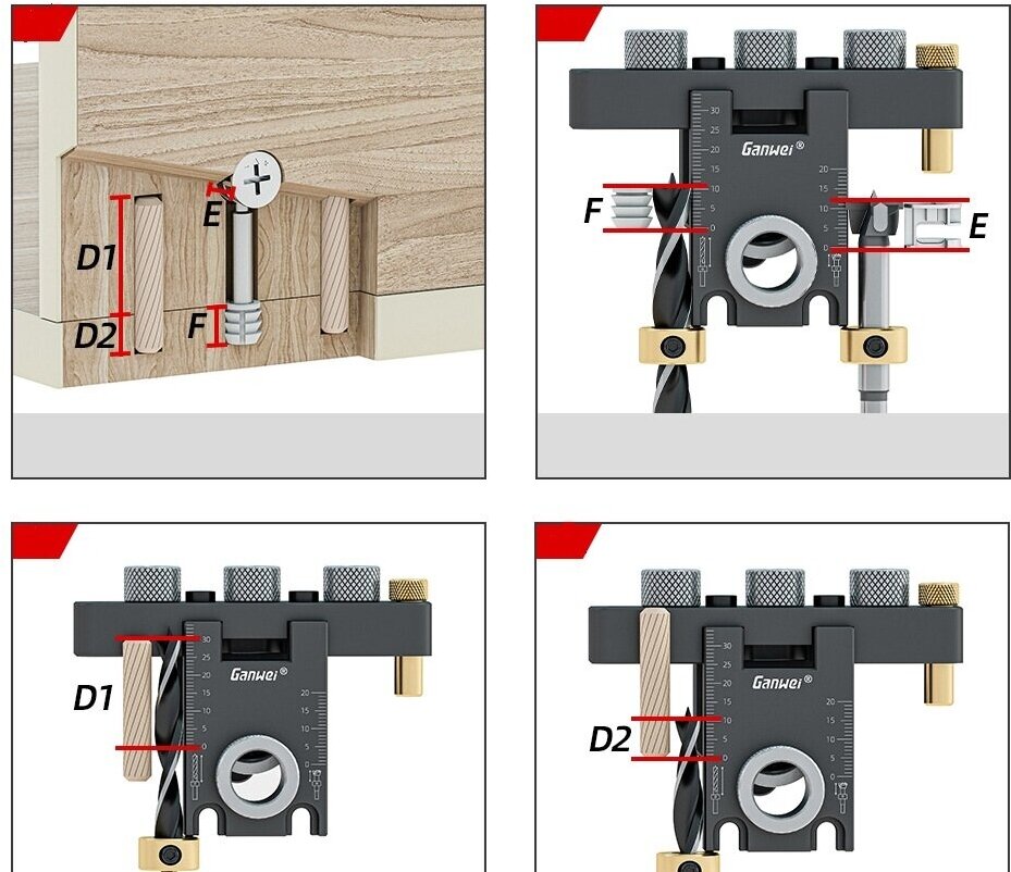 | Подробная комплектация | Кондуктор В комплекте втулки: 5мм-для присадки под конфирмат.-1 шт. 8мм для присадки под минификс-3шт 10мм под футорку.-1шт. 15мм под эксцентрик-1шт. Сверла 8 мм,10 мм,15 мм. |