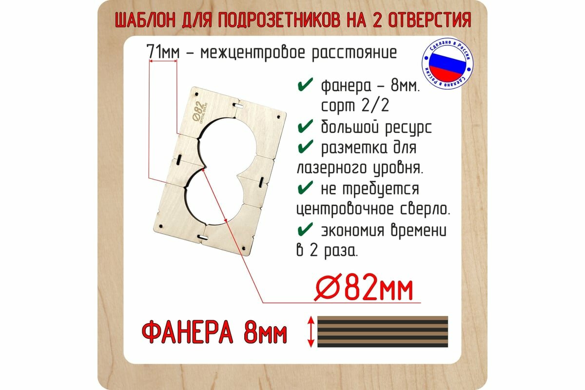 Купить Шаблон для сверления подрозетников на 2 отверстия диаметром 82 мм, толщина фанеры 8 мм ротор 2shablon82