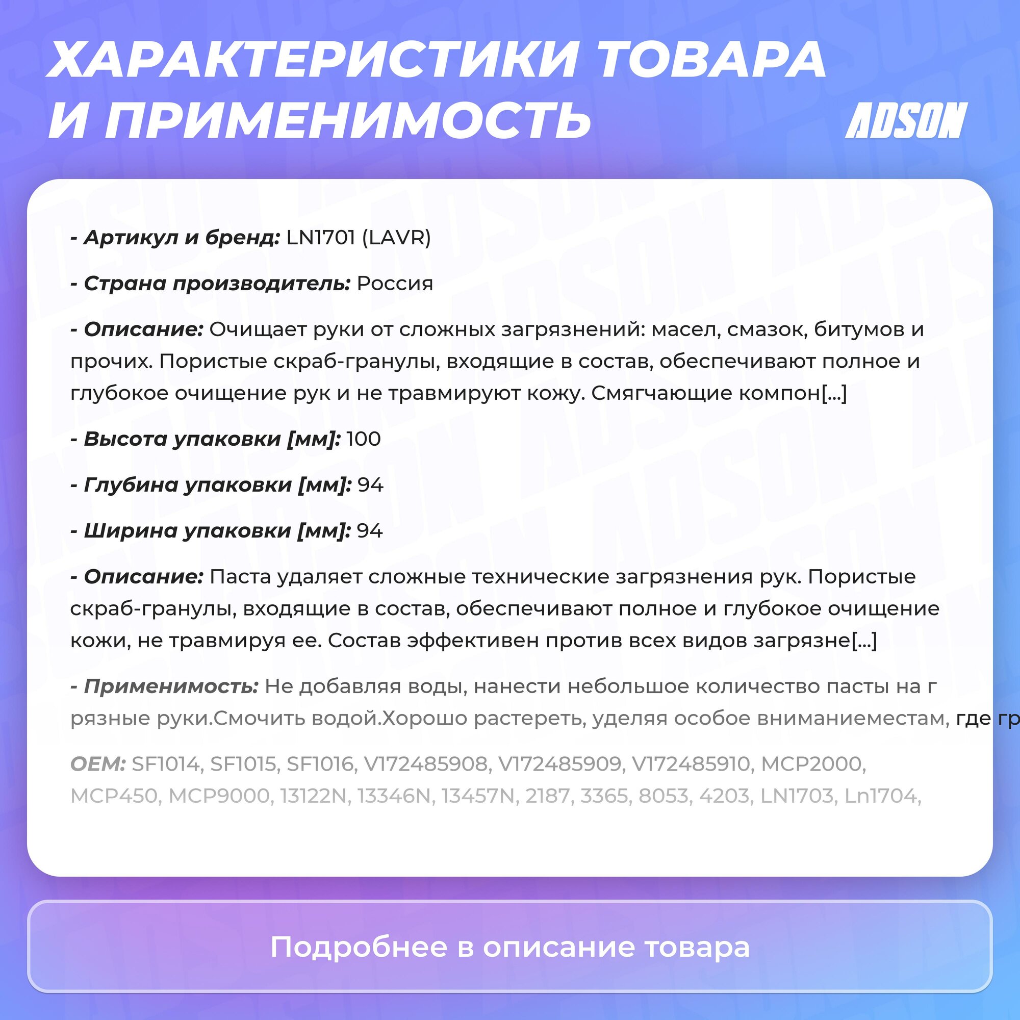 | Подробная комплектация | Паста для очистки рук, 500 мл LAVR - 1шт |