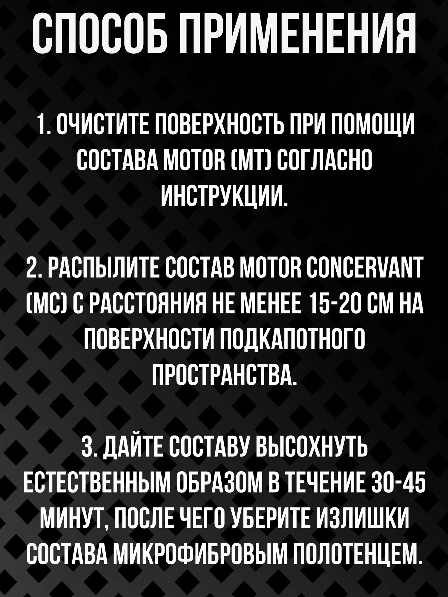 | Способ применения | 1. Очистите поверхность при помощи состава Motor (MT) согласно инструкции. 2. Распылите состав Motor Concervant (MC) с расстояния не менее 15-20 см на поверхности подкапотного пространства. 3. Дайте составу высохнуть естественным образом в течение 30-45 минут, после чего уберите излишки состава микрофибровым полотенцем. |