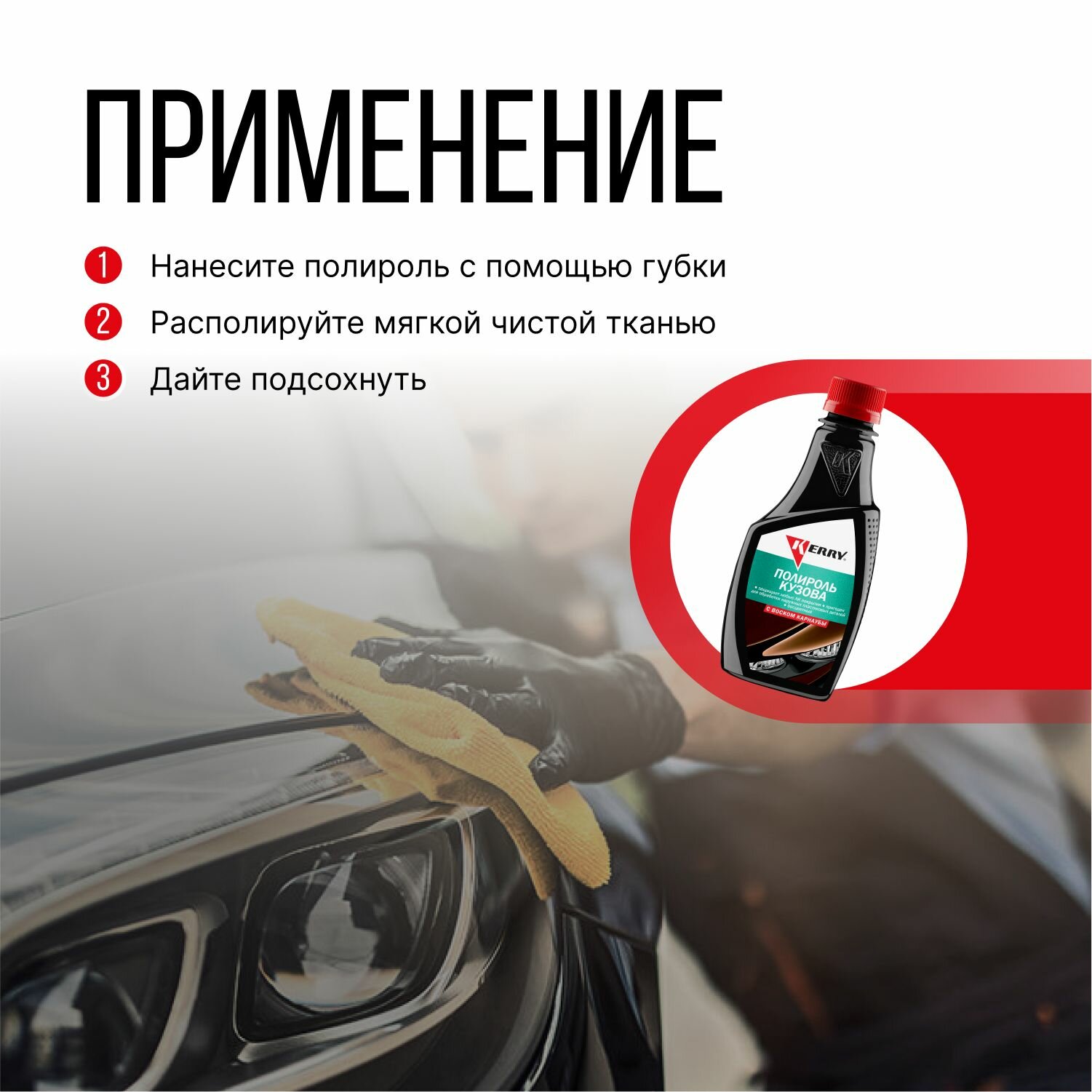 | Способ применения | хорошо встряхнуть флакон перед применением; для достижения наилучших результатов полировать автомобиль рекомендуется при температуре окружающей среды не ниже +10 °С; равномерно нанести полироль круговыми движениями с помощью губки на небольшой участок чистой, сухой поверхности кузова автомобиля; дать составу подсохнуть, затем располировать мягкой чистой тканью до образования глубокого блеска; аналогичным образом обработать весь кузов |
