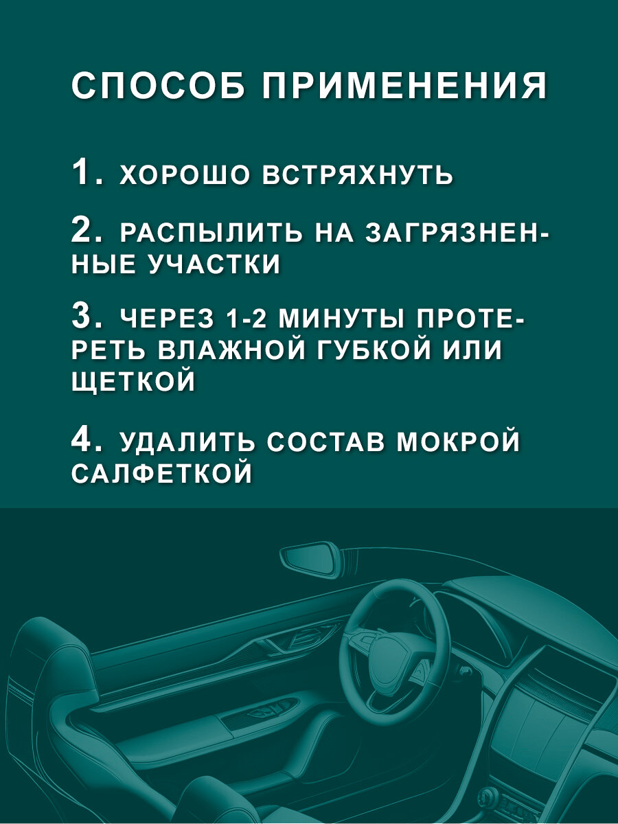 | Способ применения | 1- встряхнуть; 2- распылить на загрязненные участки; 3- через 1-2 минуты протереть влажной губкой или щёткой; 4- удалить состав мокрой салфеткой. Рекомендация: предварительно опробуйте на малозаметном участке. Некоторые поверхности могут изменить цвет. |