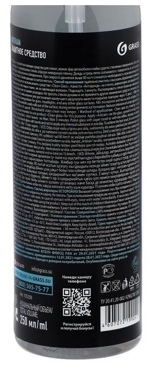 | Дополнительная информация | Водо и грязеотталкивающее средство для стекол, зеркал, фар автомобиля и любых других стеклянных поверхностей. Заполняет микропоры и микротрещины стекла, образуя невидимую пленку. Дождь и грязь легко скатываются с поверхности, в зимнее время препятствует образованию обледенения. При скорости движения выше 80 км/ч снижается необходимость пользоваться щетками стеклоочистителя. Стекло дольше остается чистым. |