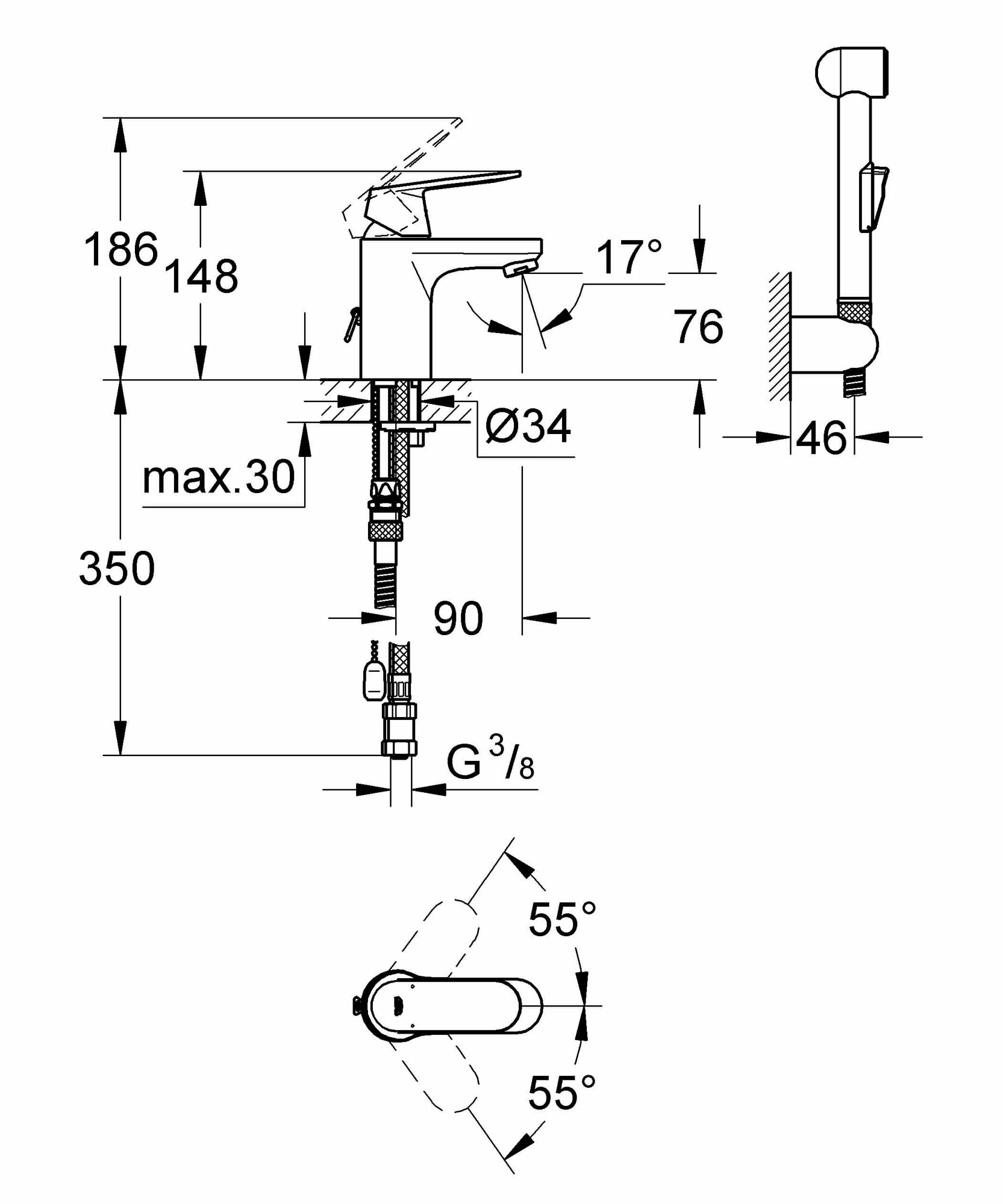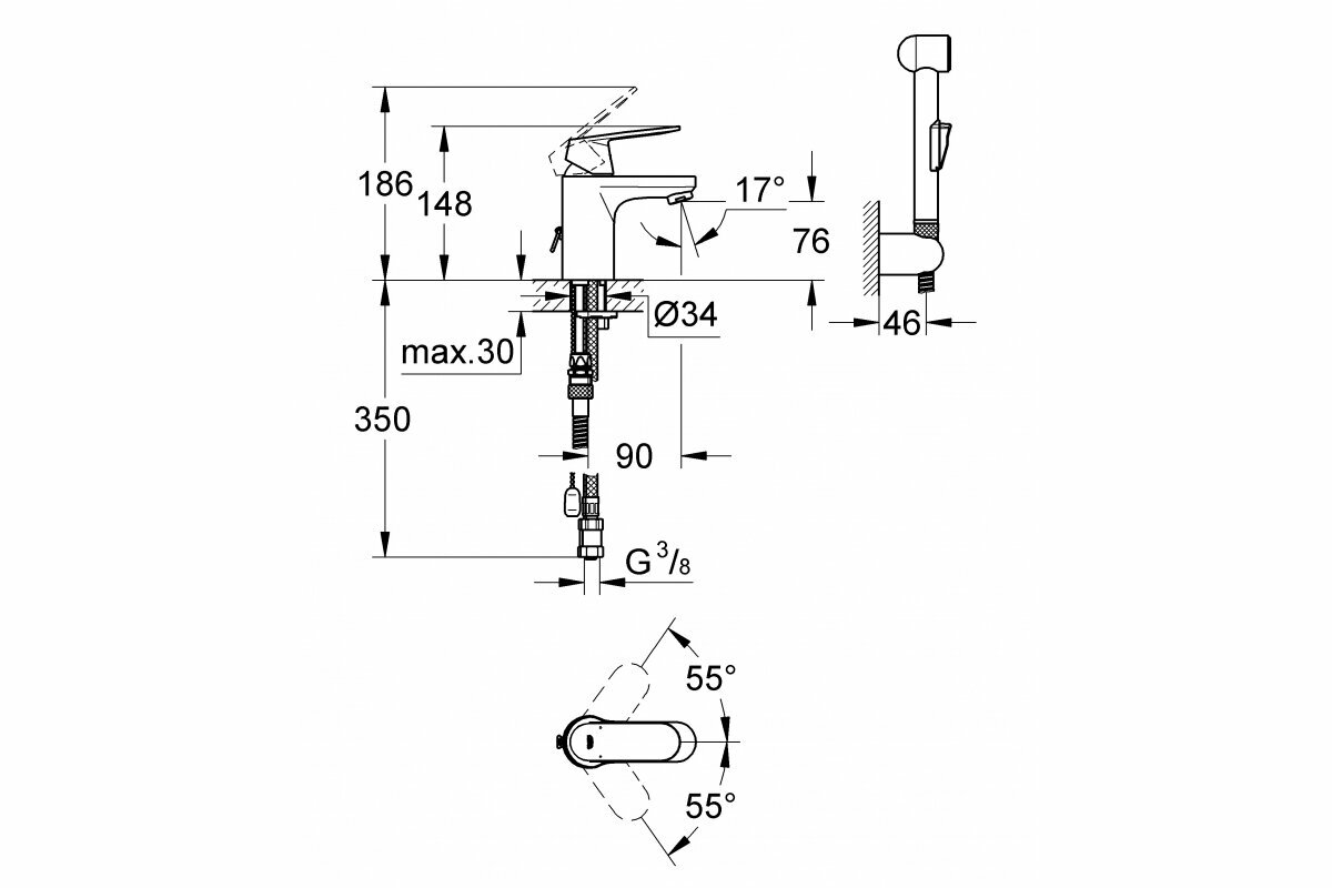 Смеситель однорычажный для раковины с гигиеническим душем, GROHE Eurosmart Cosmopolitan, S-Size, хром, (23125000)