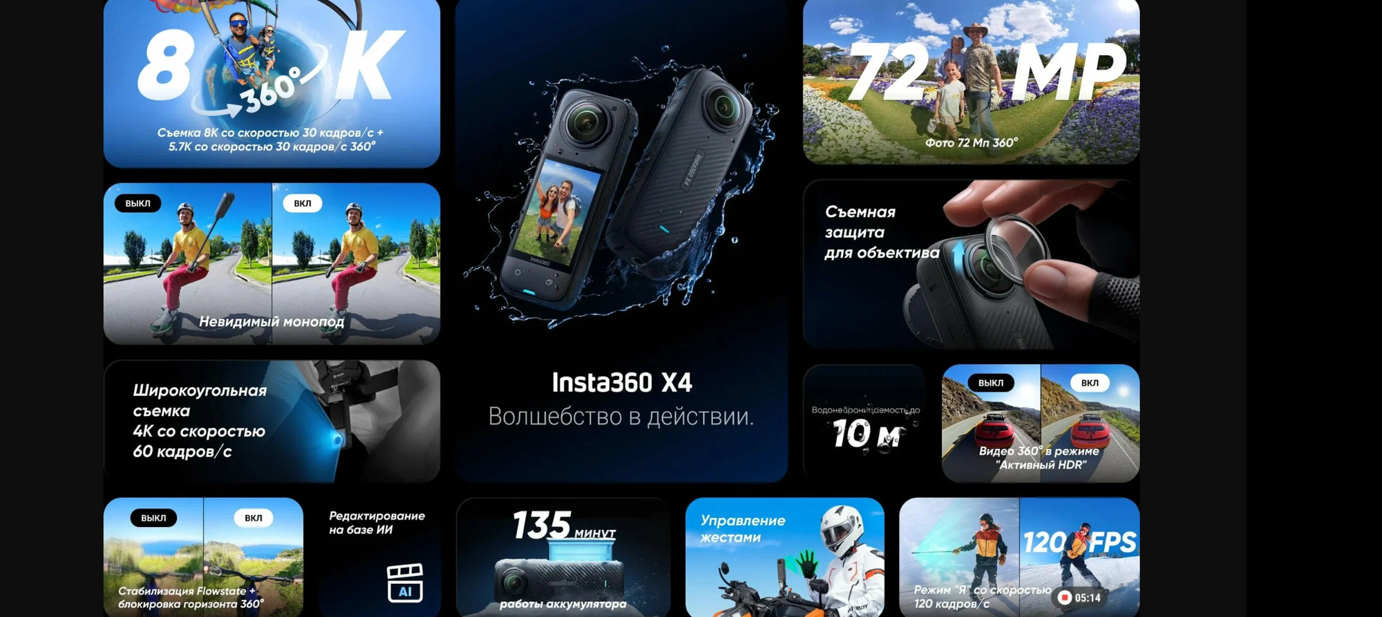 Ниже Вы можете прочитать отзывы на экшн камера Insta360 X4, ознакомится с подробными характеристиками, посмотреть интересные обзоры и фотографии на экшн камера Insta360 X4.