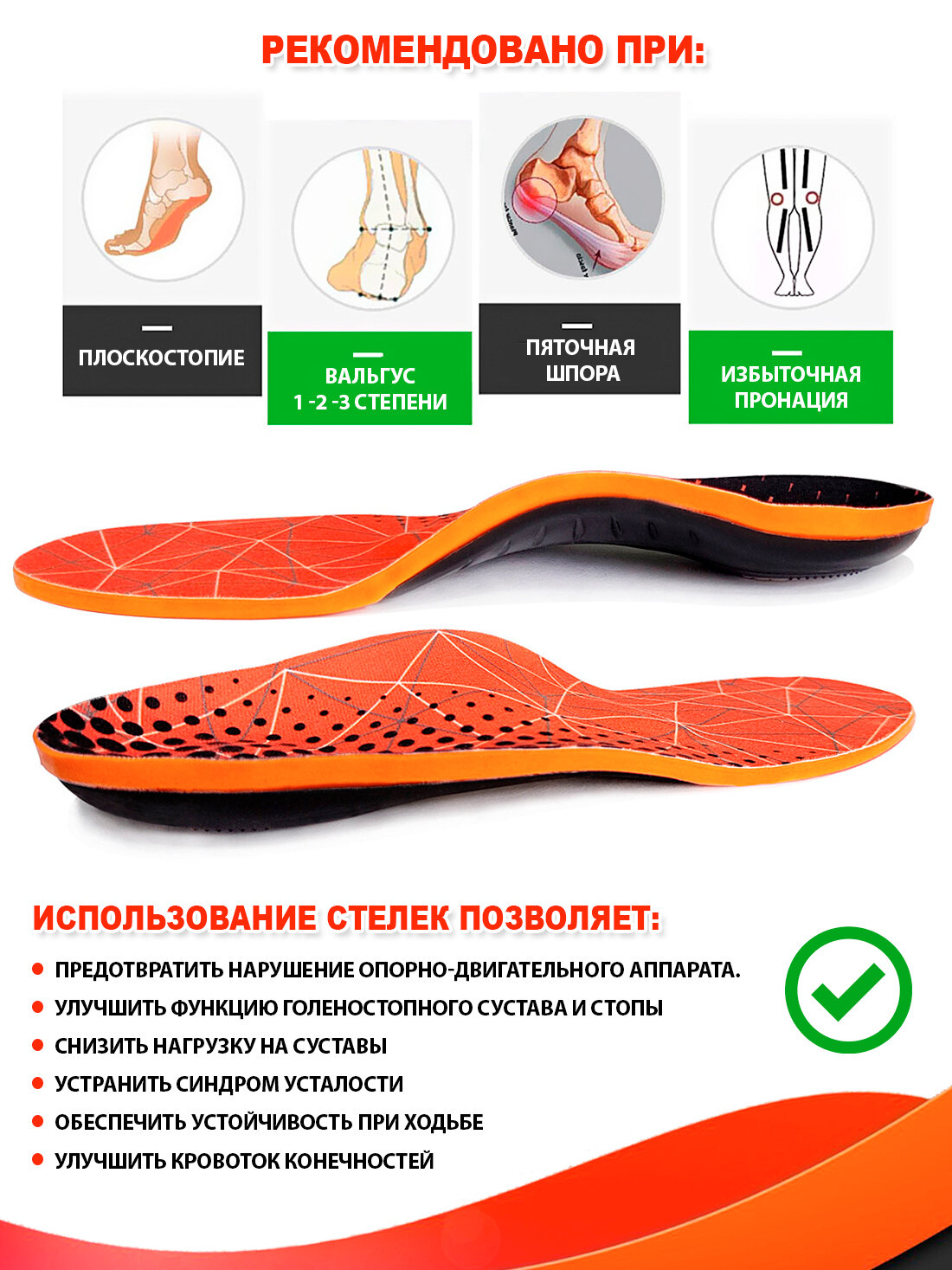 | Показания | артрит/артроз / вальгусная деформация / варусная деформация / искривление позвоночника / натоптыши / повышенная нагрузка на ноги / поперечное плоскостопие / продольно-поперечное плоскостопие / продольное плоскостопие / пяточная шпора |