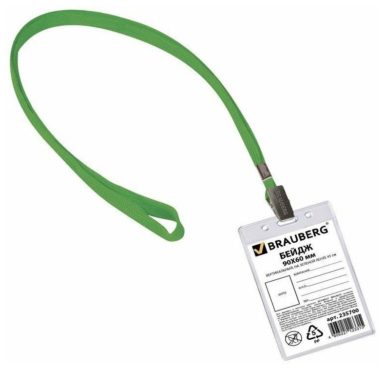 Купить Бейдж вертикальный (90х60 мм), на зеленой ленте 45 см, BRAUBERG, 235700