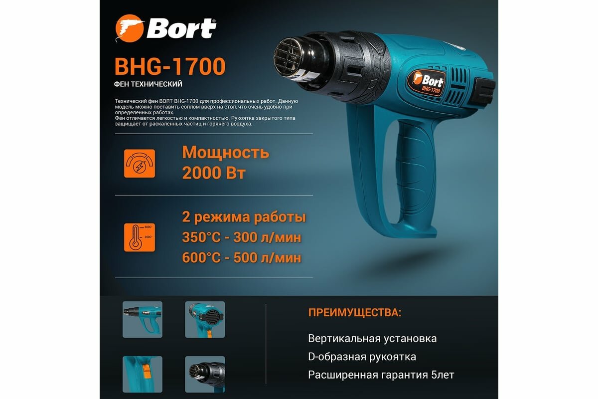 Ниже Вы можете прочитать отзывы на Технический фен BORT BHG-1700 91275691, ознакомится с подробными характеристиками, посмотреть интересные обзоры и фотографии на Технический фен BORT BHG-1700 91275691.