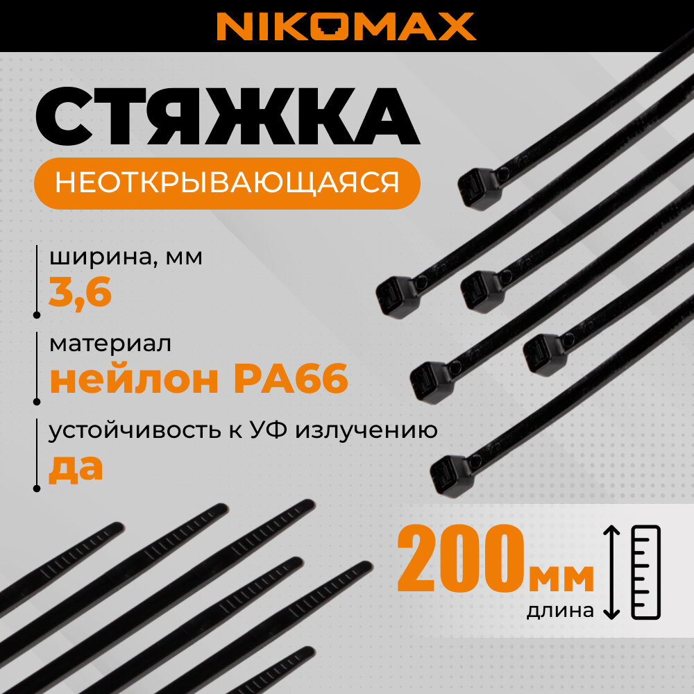 Стяжка NIKOMAX нейлоновая неоткрывающаяся, 200х3,6мм, устойчивая к УФ, черная, уп-ка 100шт. интересное: