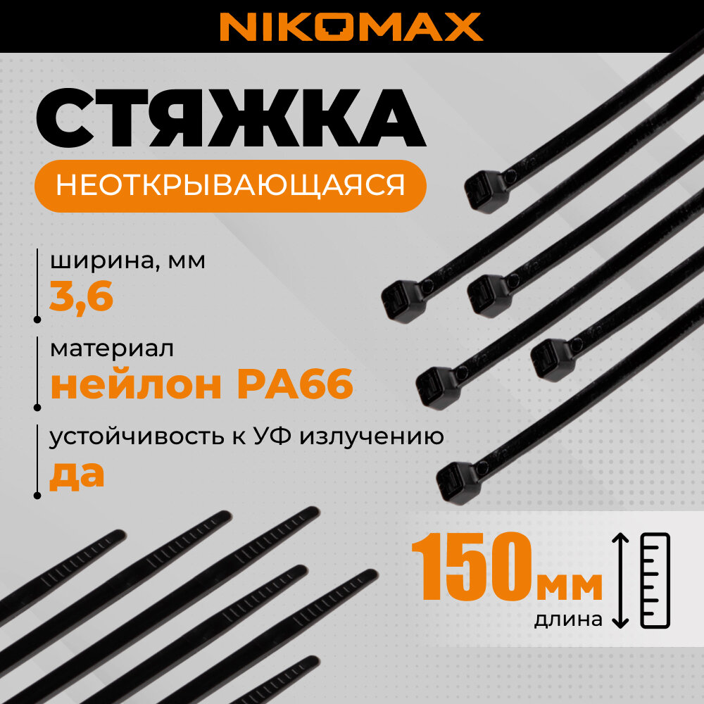 Стяжка NIKOMAX нейлоновая неоткрывающаяся, 150х3,6мм, устойчивая к УФ, черная, уп-ка 100шт. интересное: