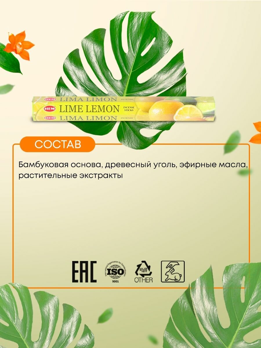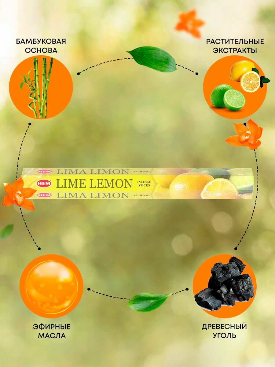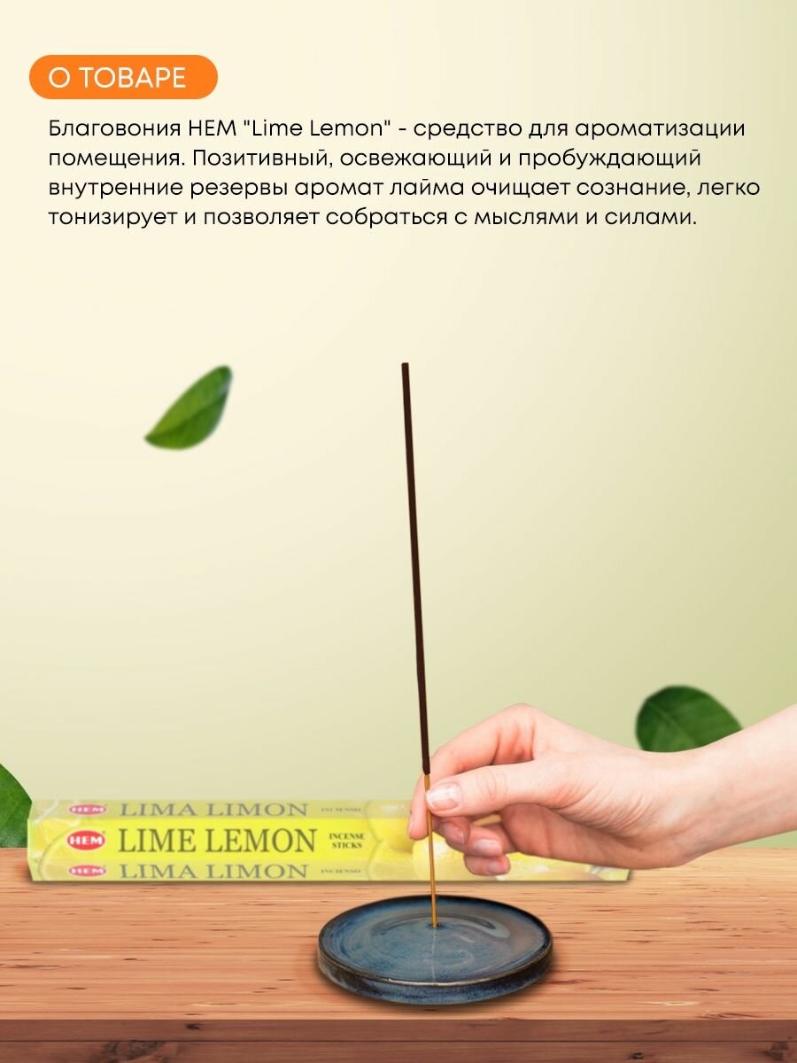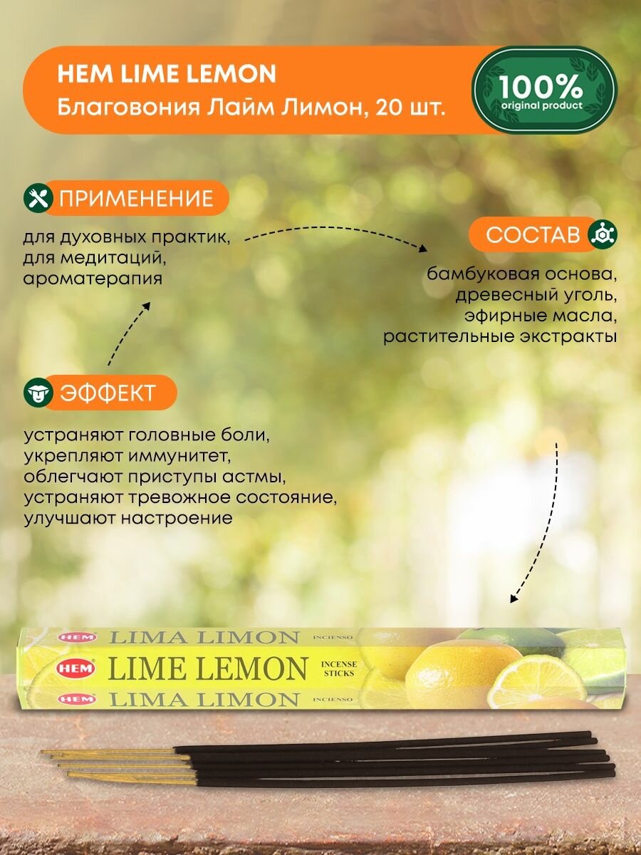 Благовония Индийские ароматические палочки для дома, йоги и ароматерапии Лайм и лимон (Lime lemon incense sticks) HEM ХЭМ, 20шт интересное: