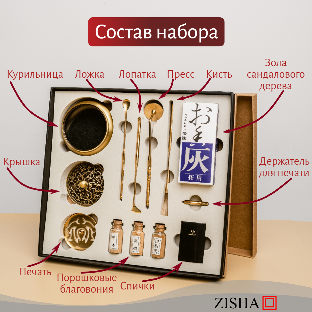 | Комплектация | курильница - 1шт, ложечка - 1шт, пресс - 1шт, благовония - 3шт, зола - 1шт |