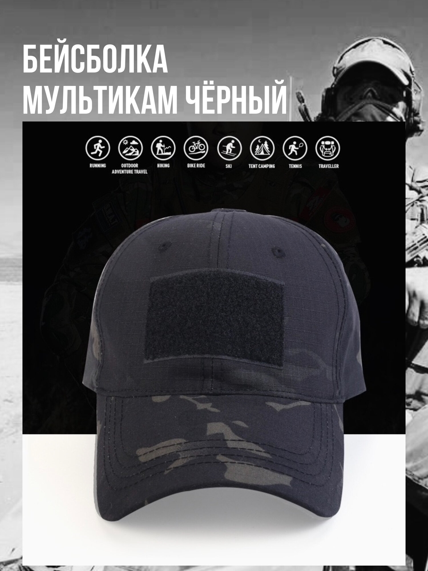 Кепка черная мужская тактическая военная на липучке бейсболка
