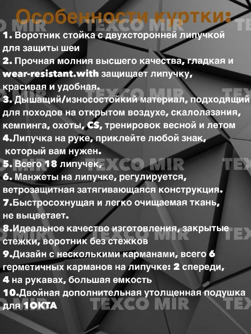 | Защитные свойства | ветрозащитный / влагозащищённый / камуфляжный |