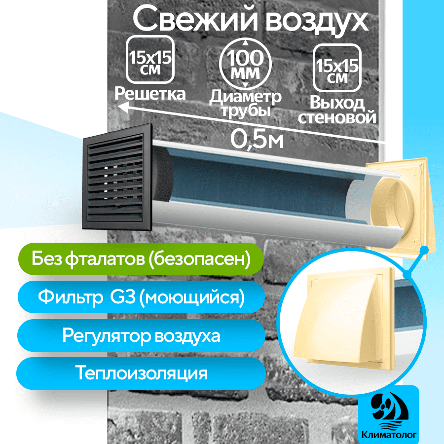 Приточный клапан вентиляционный, КП-1005-04-WB, диаметр 100мм, длина 0,5м