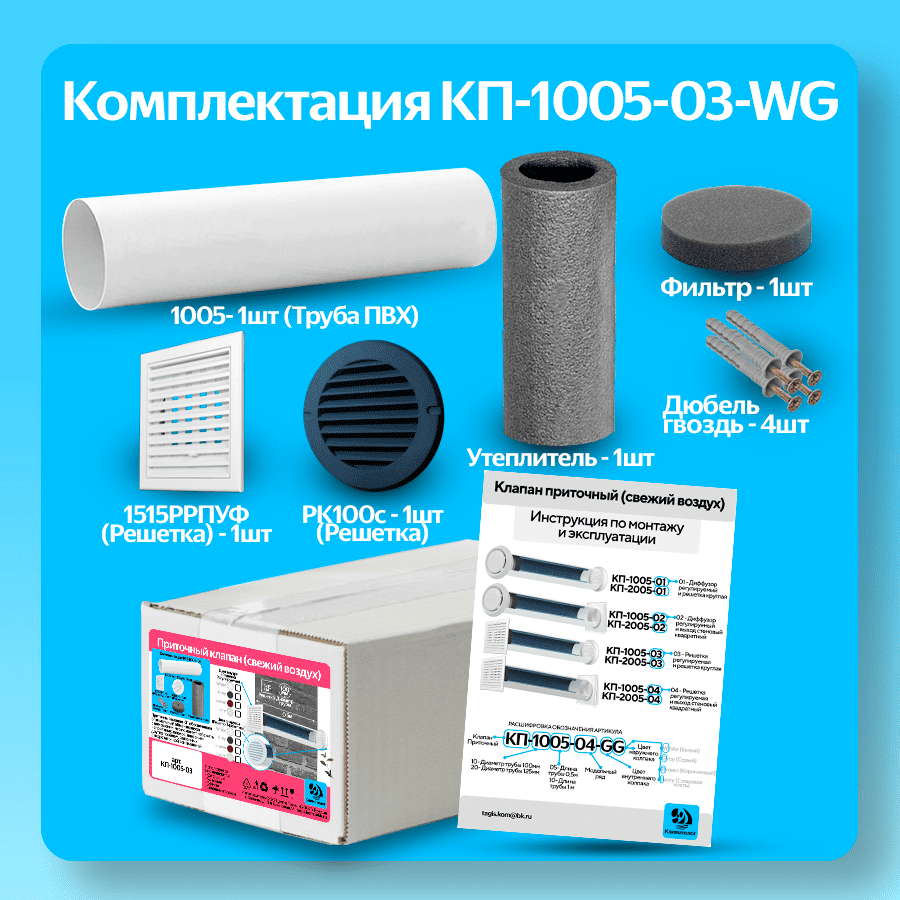 Приточный клапан вентиляционный, КП-1005-03-WB, диаметр 100мм, длина 0,5м