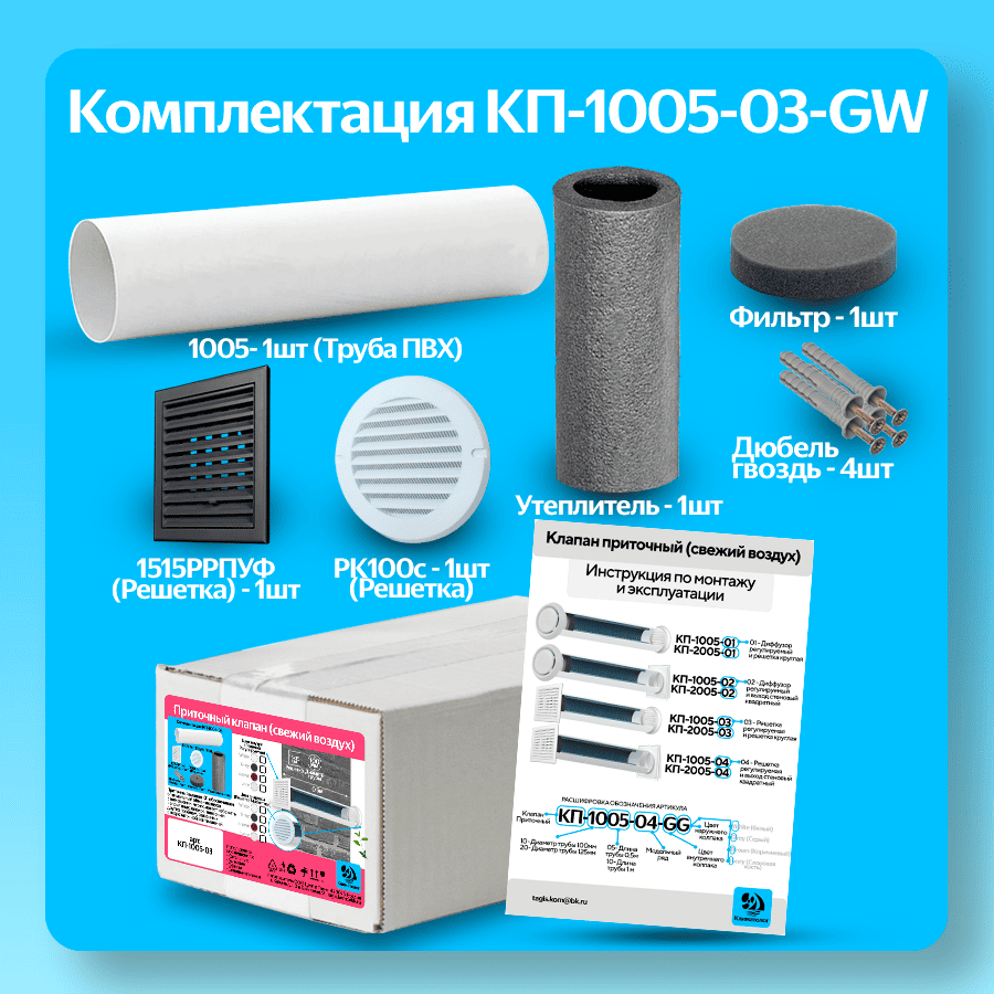 Приточный клапан вентиляционный, КП-1005-03-GB, диаметр 100мм, длина 0,5м