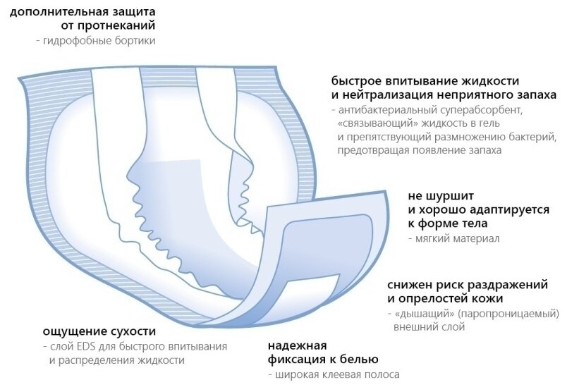 | Материалы | целлюлоза, суперабсорбент, нетканый материал, паропроницаемый ламинат, эластомерная пряжа, клеи, силиконизированная бумага. |