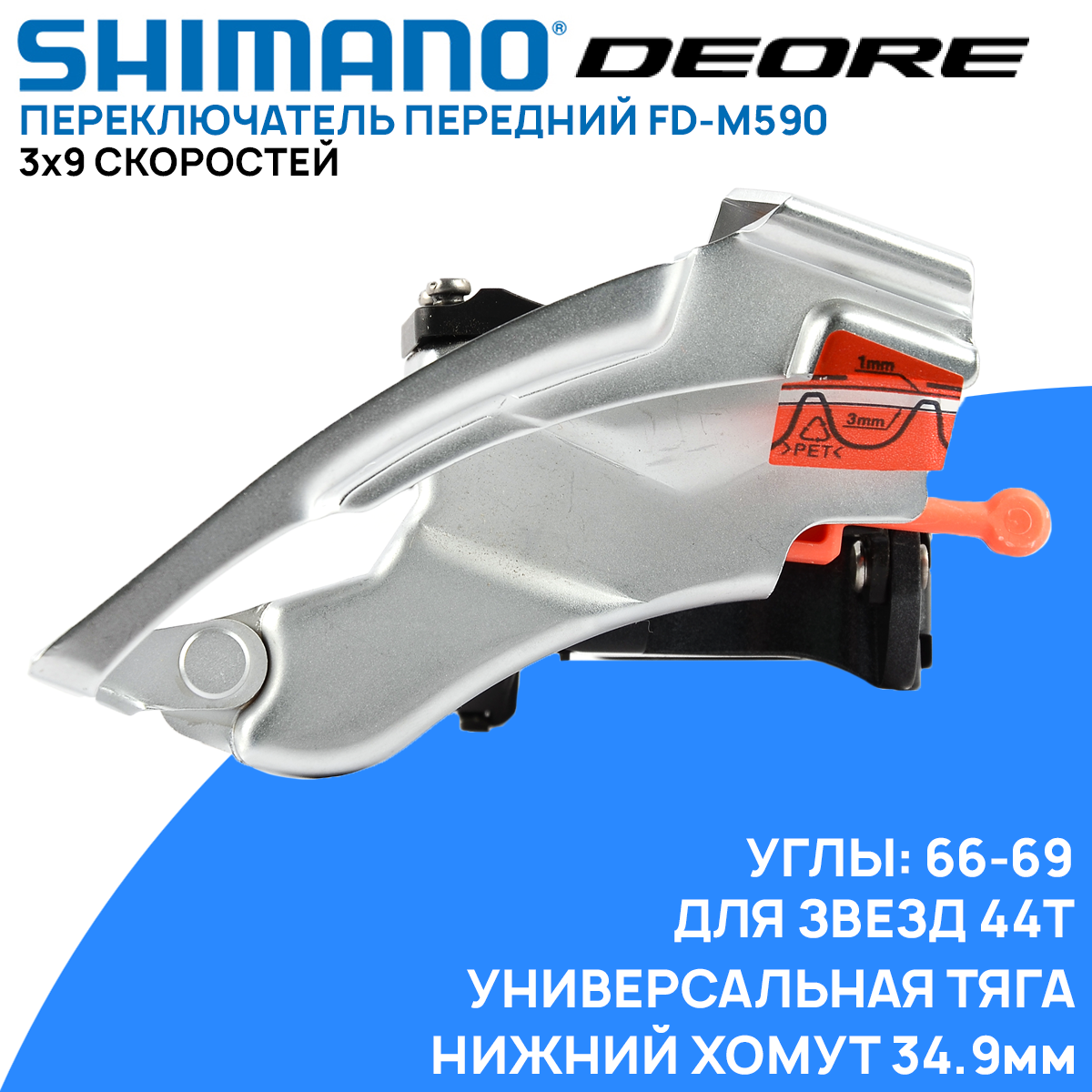 Переключатель передний Shimano DEORE FD-M590, на 3х9 скоростей, универсальная тяга, нижний хомут 34.9мм, для звезд 44Т, углы 66-69 интересное:
