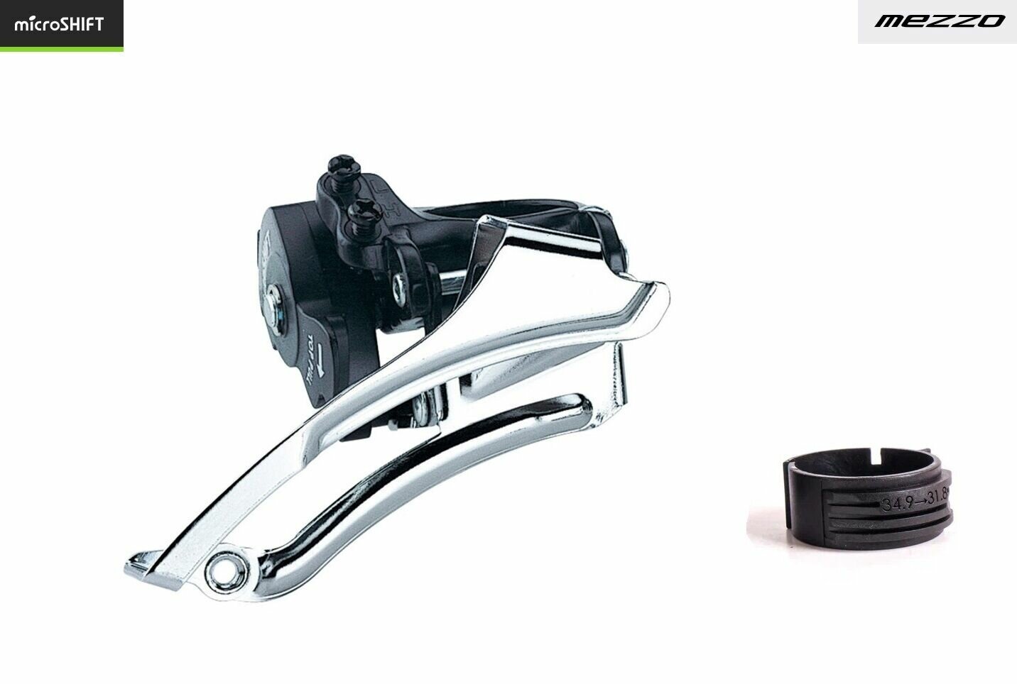 Переключатель передний MICROSHIFT Mezzo FD-M20, универсальная тяга, хомут адаптер 31,8-34,9 мм, угол 66-69° (NN009465) интересное: