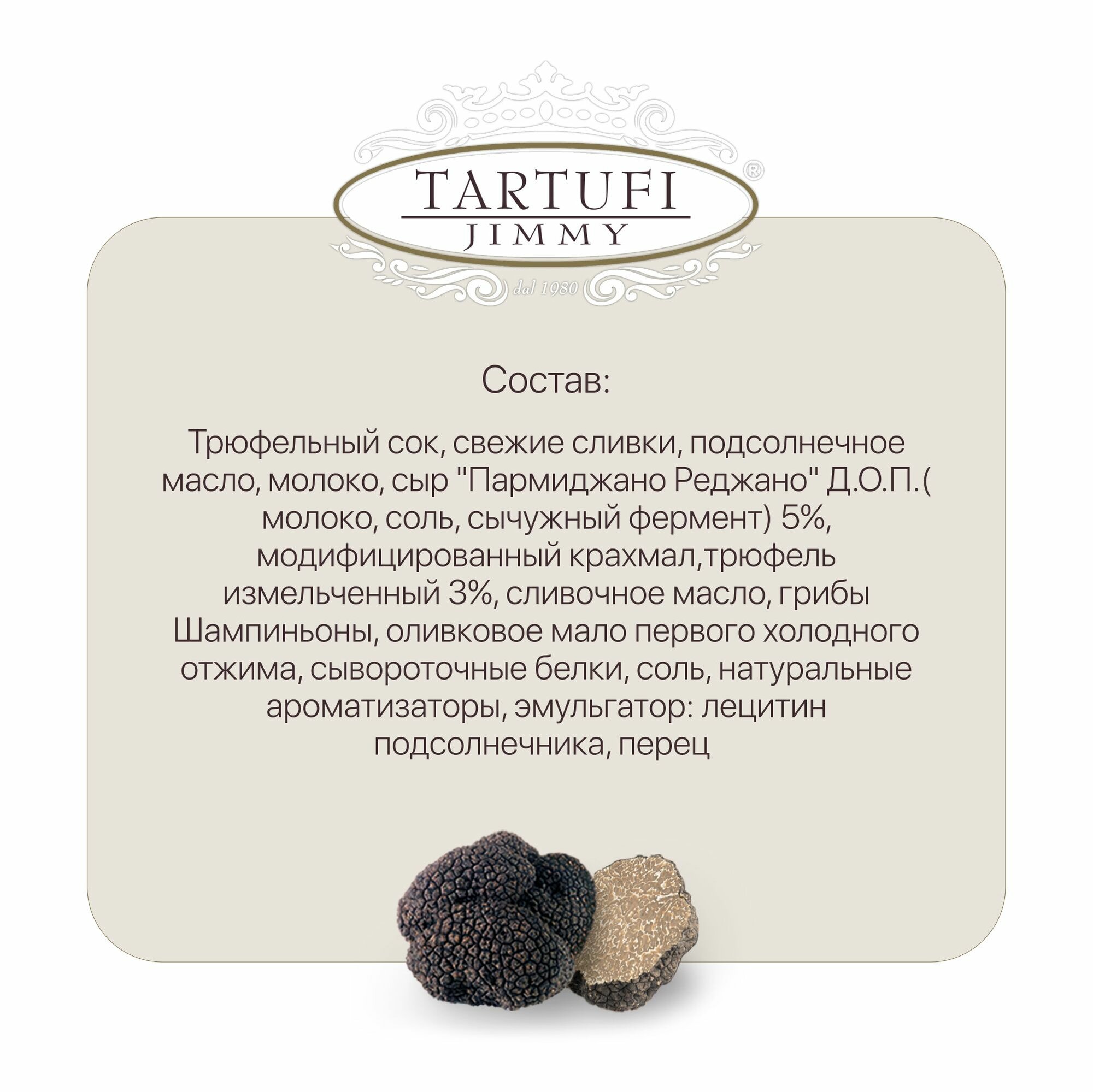 | Состав | Трюфельный сок, свежие сливки, подсолнечное масло, молоко, сыр Пармиджано Реджано Д.О.П.( молоко, соль, сычужный фермент) 5%, модифицированный крахмал,трюфель измельченный 3%, сливочное масло, грибы Шампиньоны, оливковое мало первого холодного отжима, сывороточные белки, соль, натуральные ароматизаторы, эмульгатор: лецитин подсолнечника, перец |