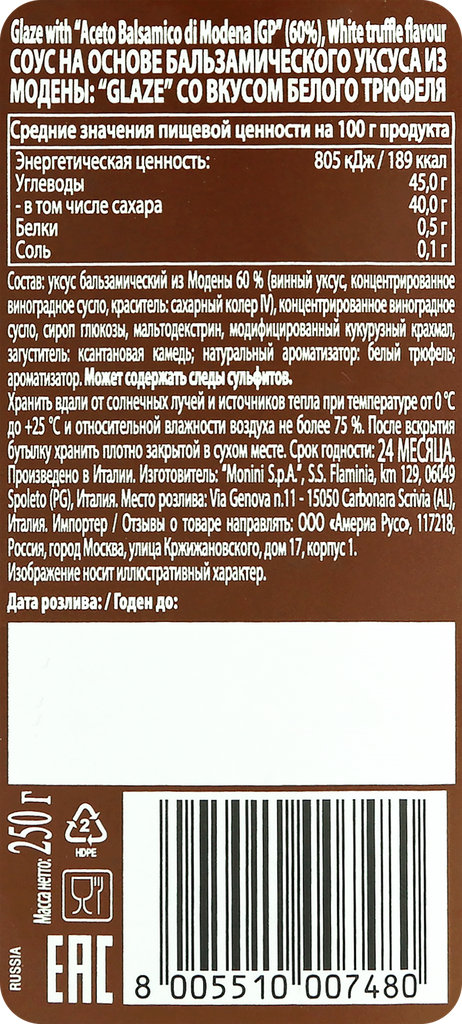 | Состав | уксус бальзамический из Модены 60 % (винный уксус, концентрированное виноградное сусло, краситель: сахарный колер IV), концентрированное виноградное сусло, сироп глюкозы, мальтодекстрин, модифицированный кукурузный крахмал, загуститель: ксантановая камедь; натуральный ароматизатор: белый трюфель; ароматизатор |