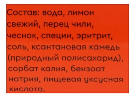 | Состав | вода, ананас, подсластитель эритрит, перец красный сладкий, уксус натуральный, чеснок, загуститель ксантановая камедь, соль, масло оливковое, имбирь свежий, перец чили, регулятор кислотности лимонная кислота, консервант сорбиновая кислота, смесь специй, растительный экстракт Луо Хан Гуо |
