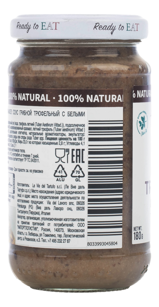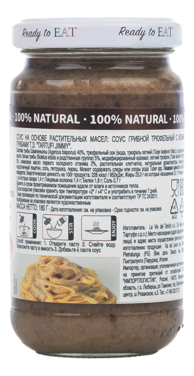 | Состав | грибы Шампиньоны 40%, трюфельный сок(вода трюфель летний), подсолнечное масло, белые грибы 5%, модифицированный крахмал, летний трюфель (Tuber aestivum) 3%, оливковое масло первого холодного отжима 2%, растительная клечатка, натуральные ароматизаторы, эмульгатор: подсолнечный лецитин, соль, петрушка, перец |
